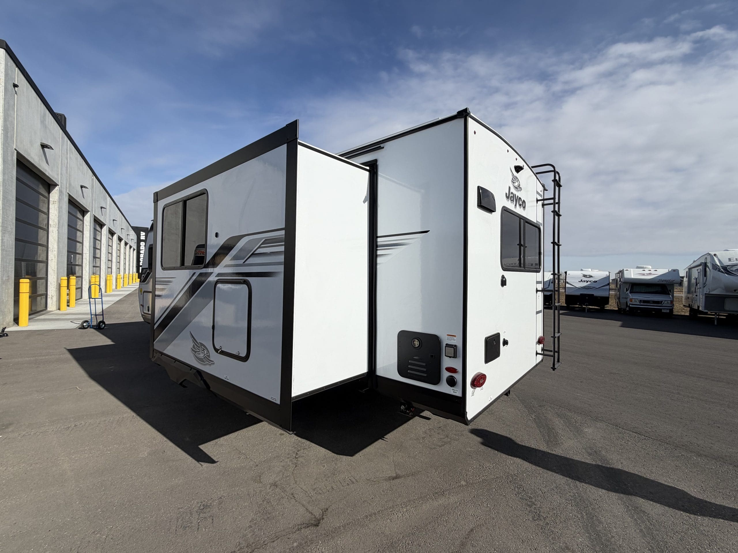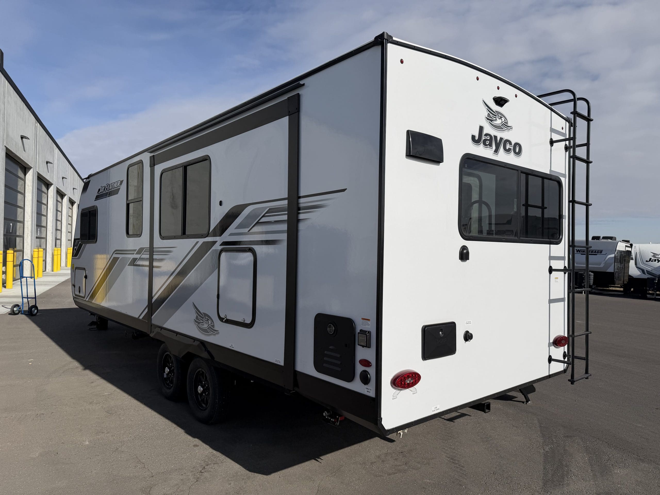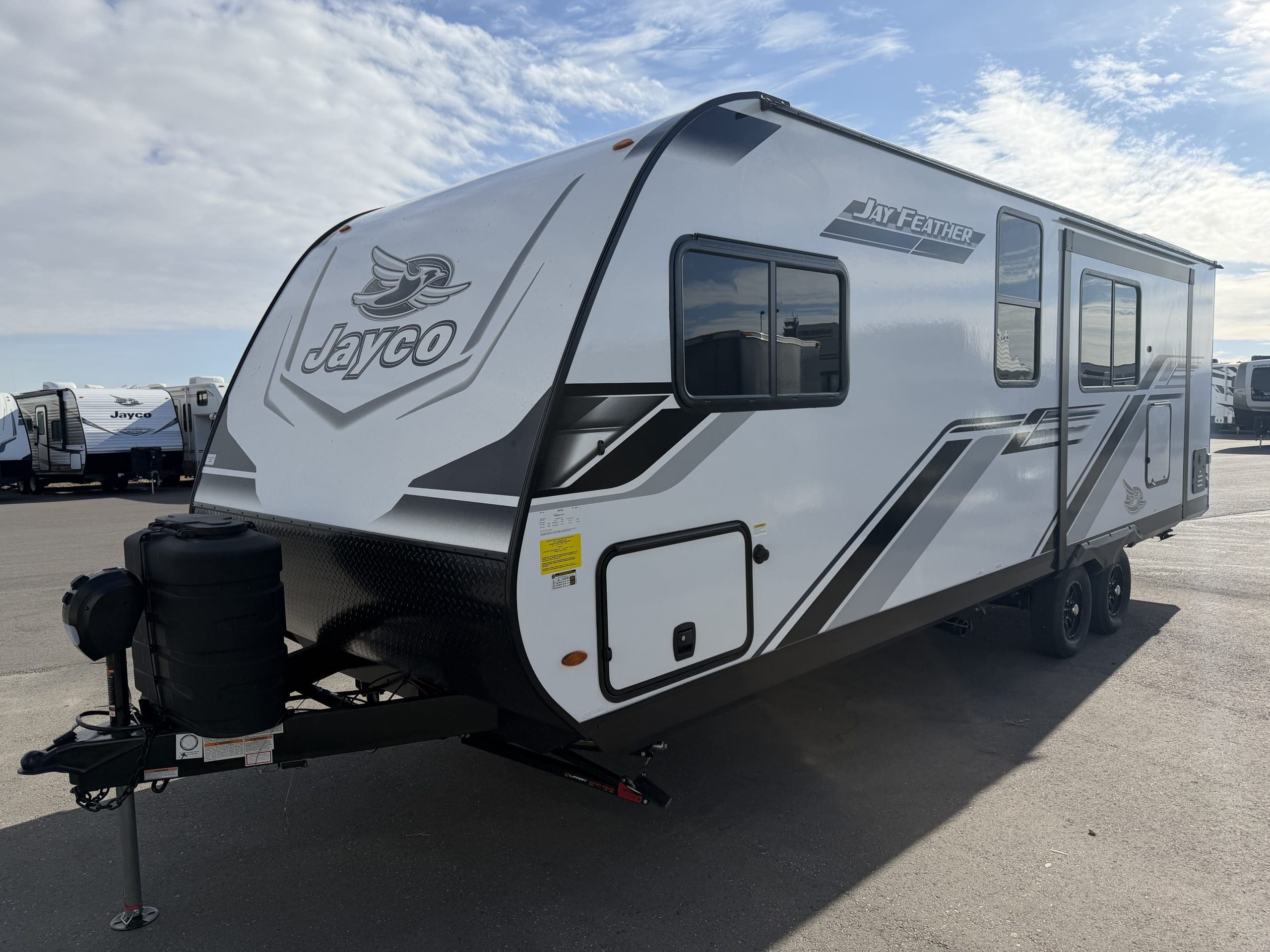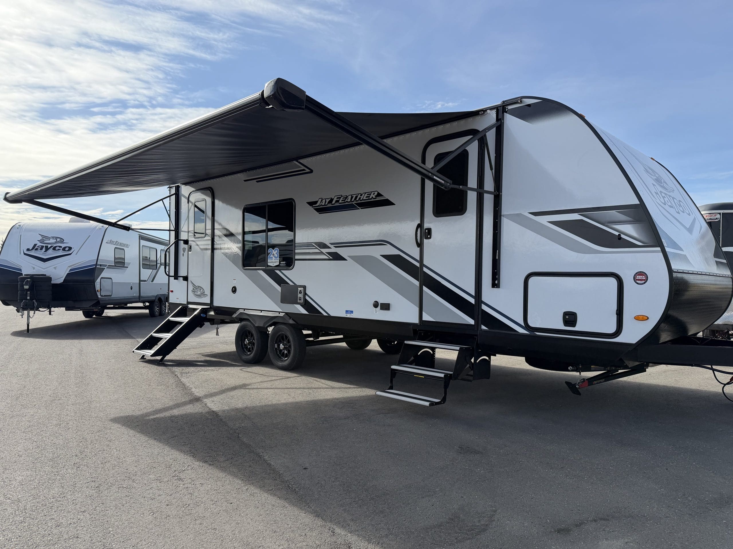 JAY SPORT PACKAGE* (11 Cu.Ft. 12 Vol Fridge, App Monitored TPMS, Climate Shield *0-100 degree Tested Weather Insulation, Front Slam Latch Baggage doors, Invision Kitchen Appliance Package, Solid fold down Step w/ Aluminum Tread on Main Entry Door Step, LED Smart TV, Modern Graphics Package, 200 Watt Solar Panel and 30 Amp Digital Controller, Stainless Double Basin Kitchen Sink, Keyed Alike Doors, Rear Exterior Ladder, Dark Tinted Safety Glass Windows).