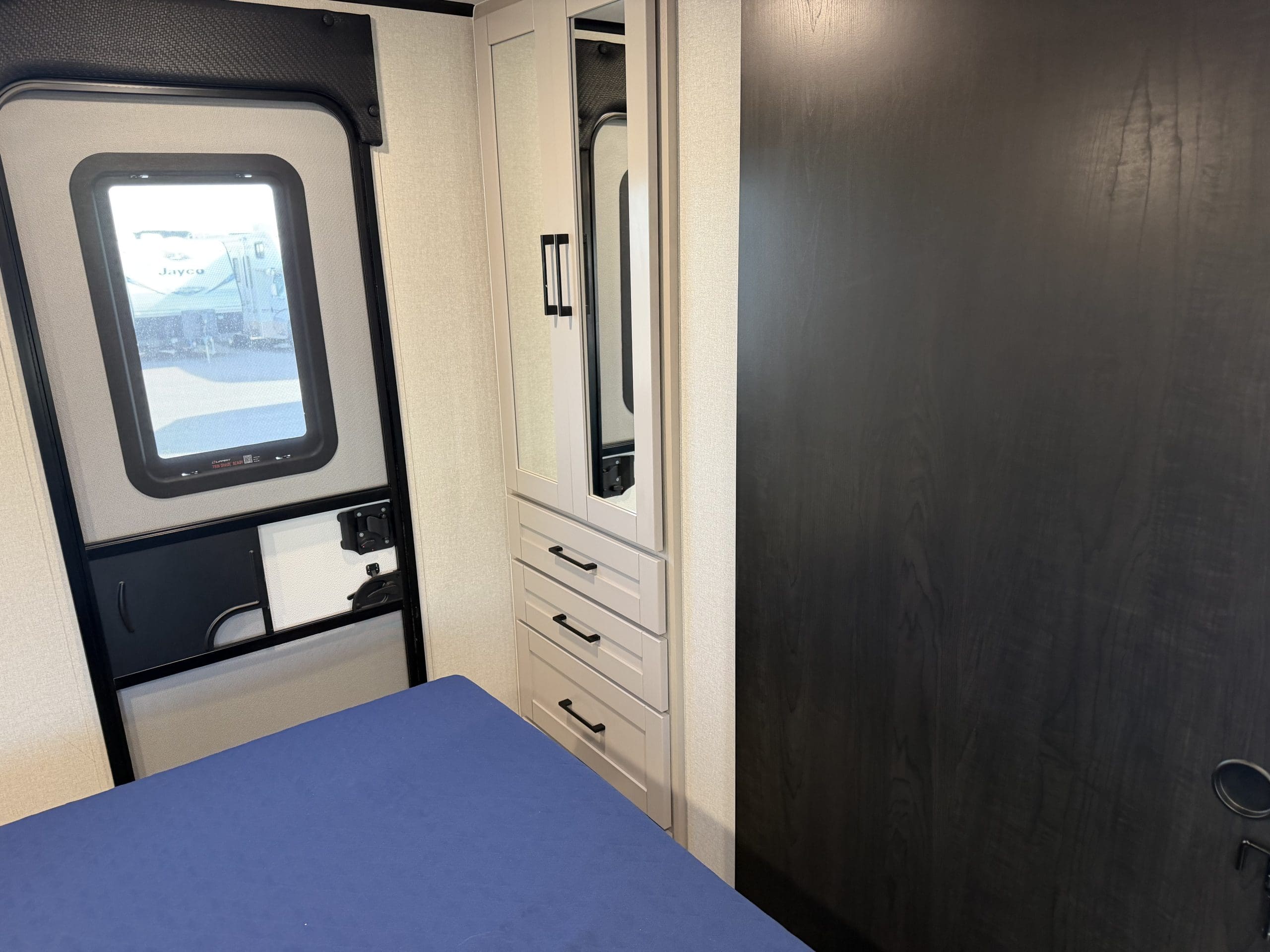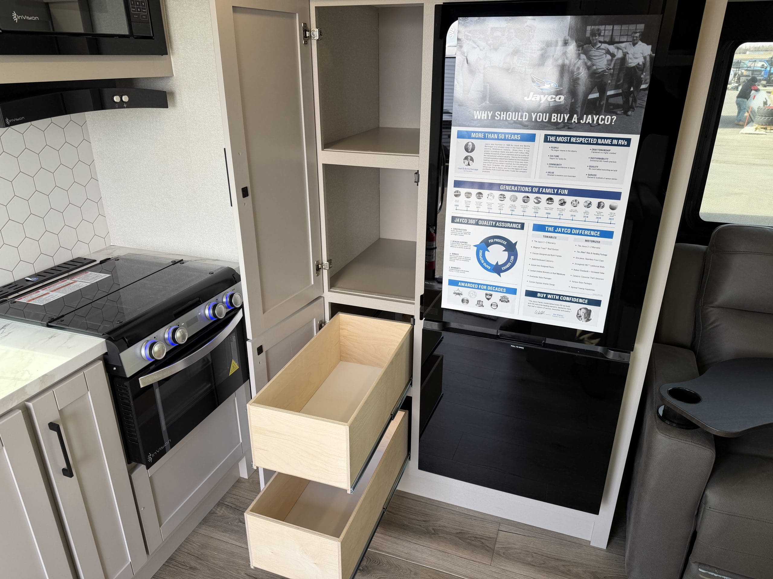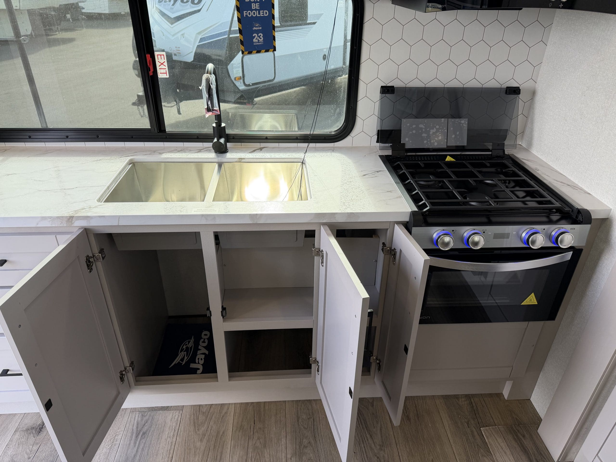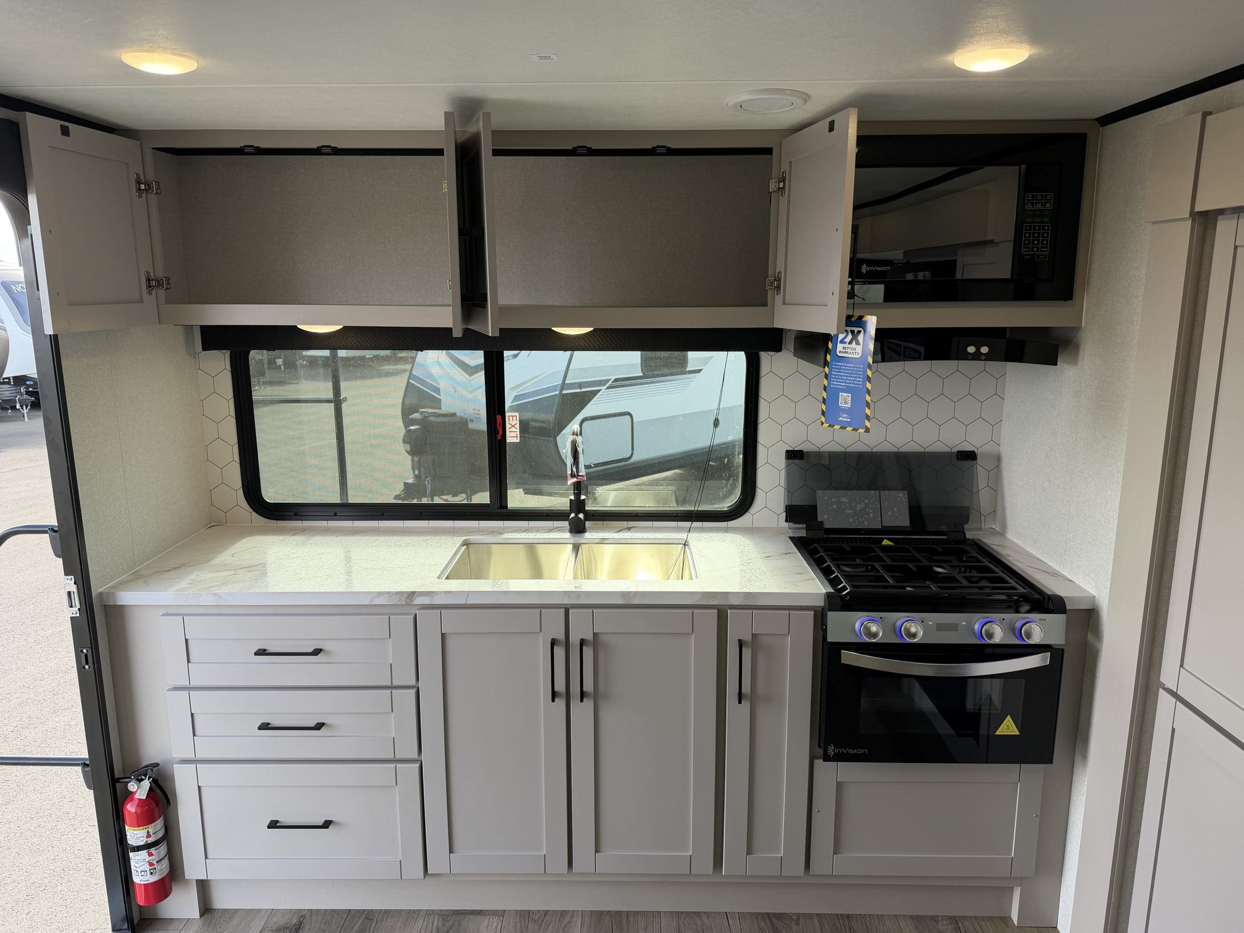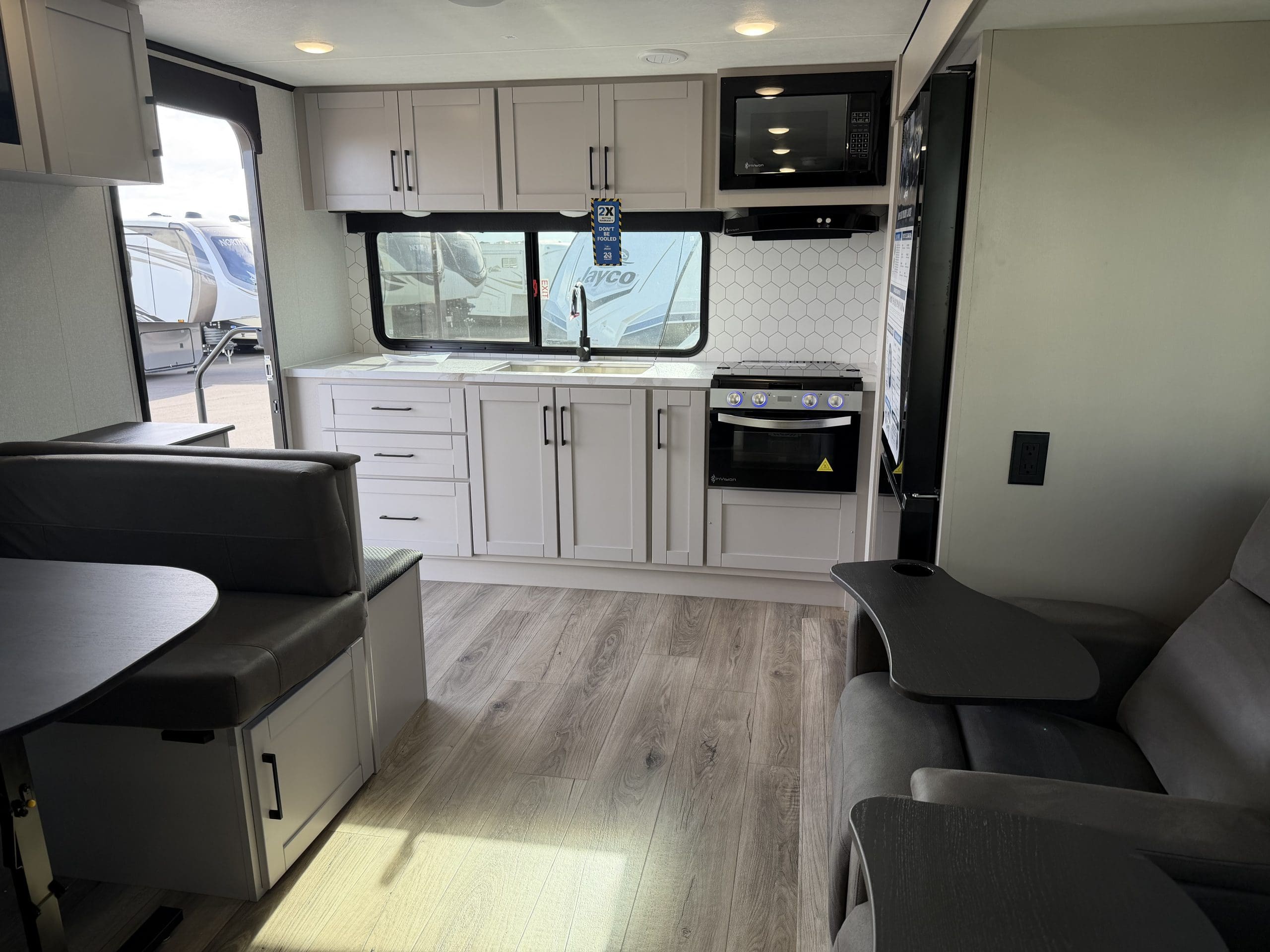 JAY SPORT PACKAGE* (11 Cu.Ft. 12 Vol Fridge, App Monitored TPMS, Climate Shield *0-100 degree Tested Weather Insulation, Front Slam Latch Baggage doors, Invision Kitchen Appliance Package, Solid fold down Step w/ Aluminum Tread on Main Entry Door Step, LED Smart TV, Modern Graphics Package, 200 Watt Solar Panel and 30 Amp Digital Controller, Stainless Double Basin Kitchen Sink, Keyed Alike Doors, Rear Exterior Ladder, Dark Tinted Safety Glass Windows).