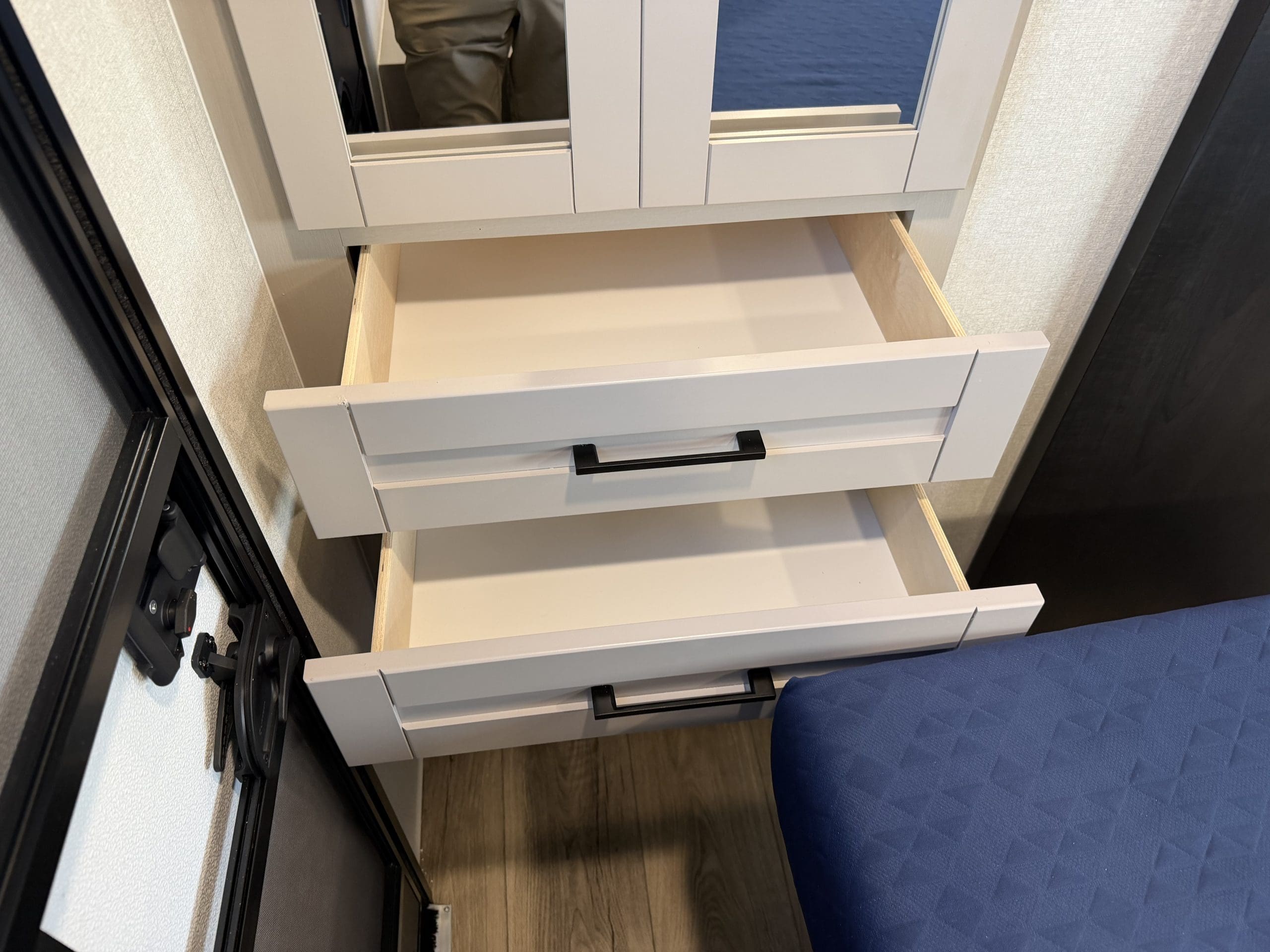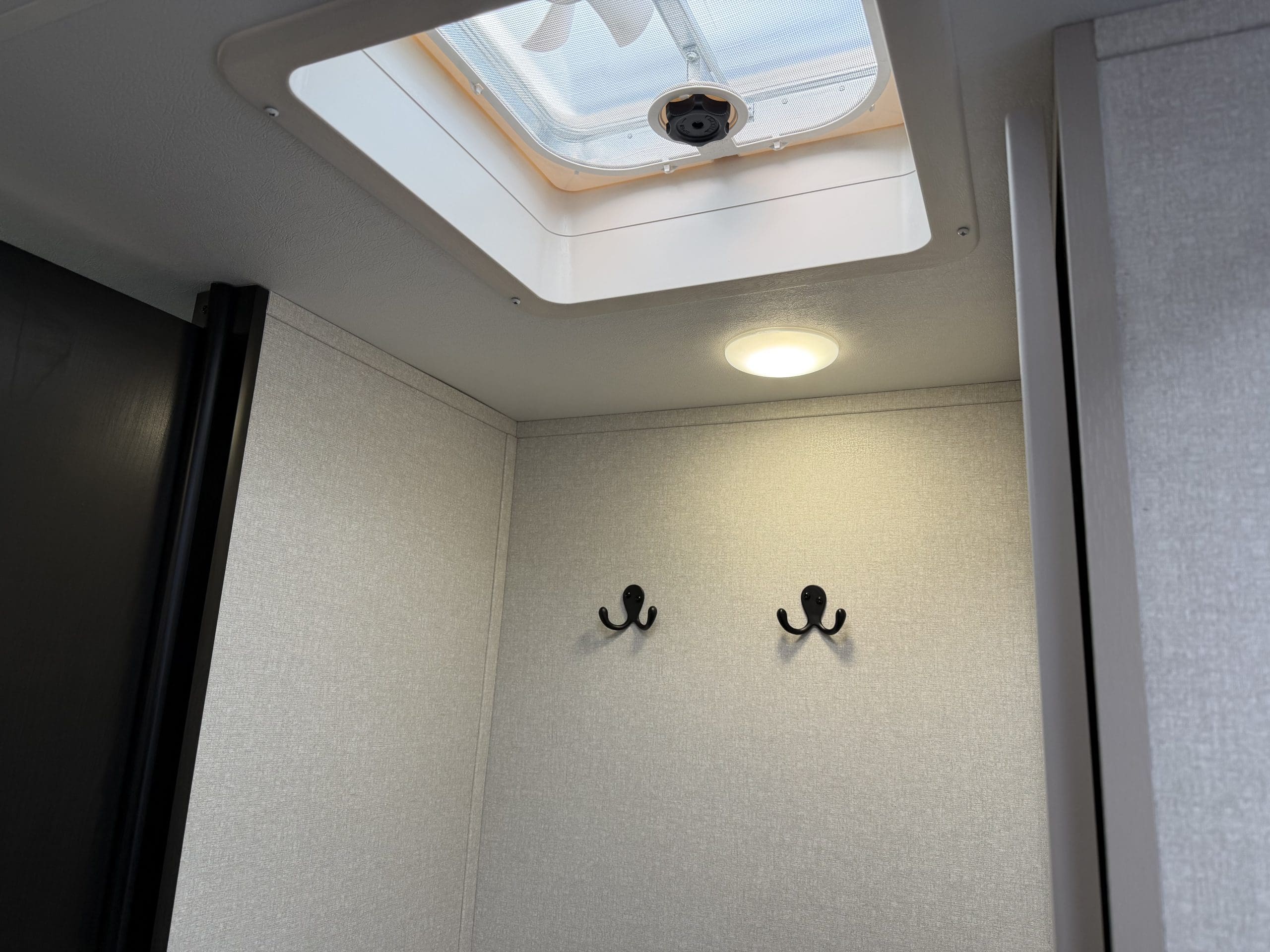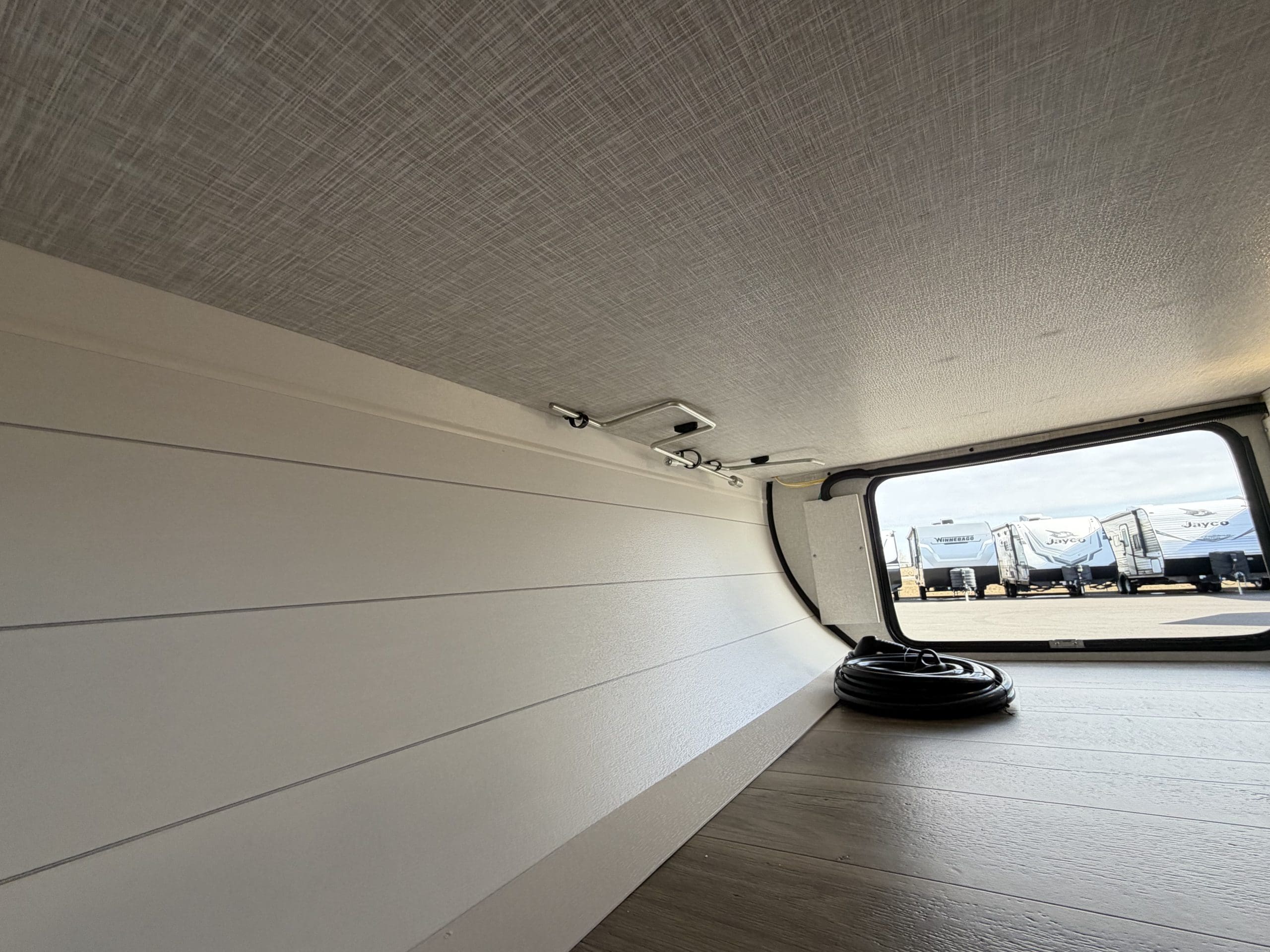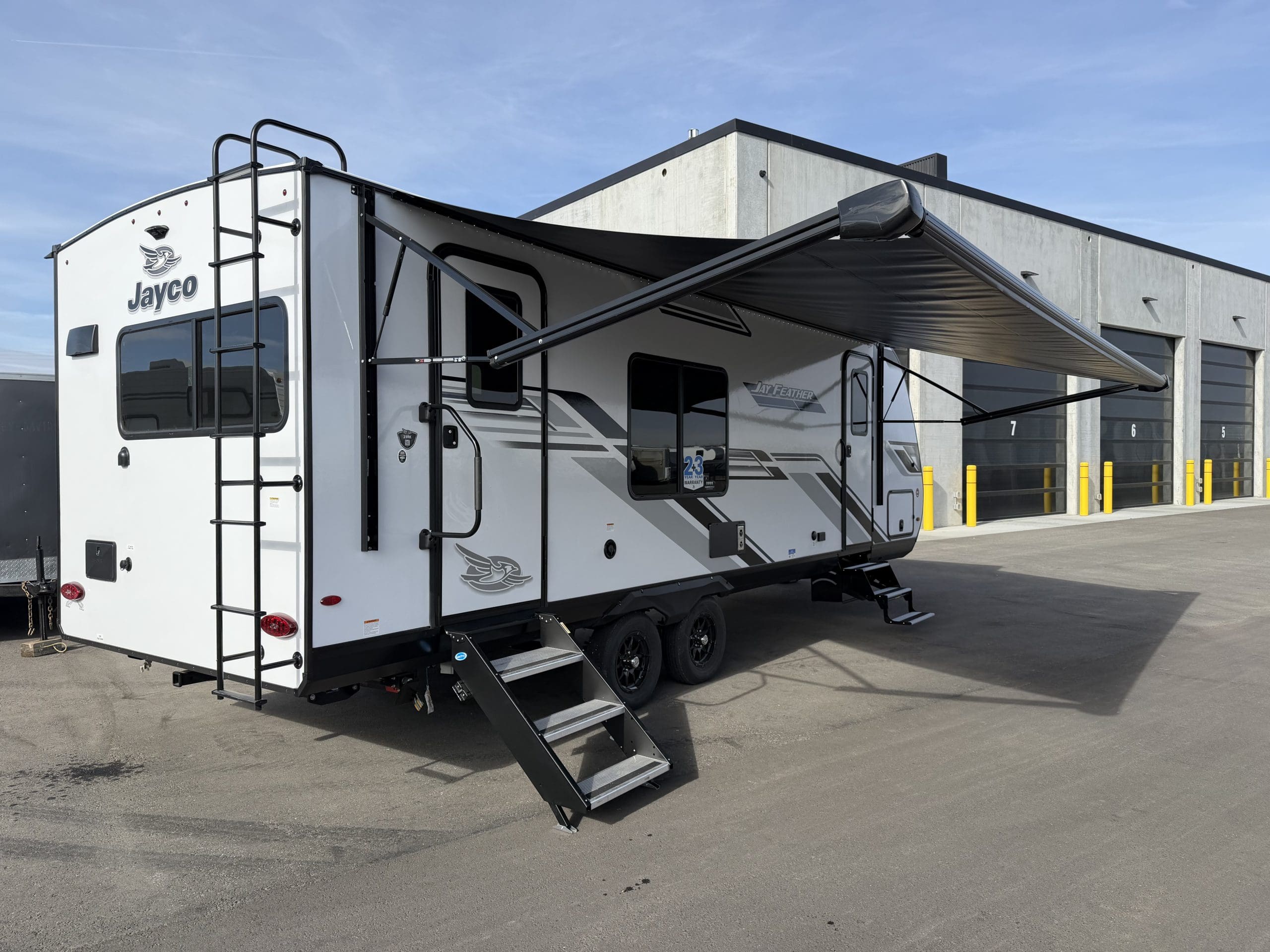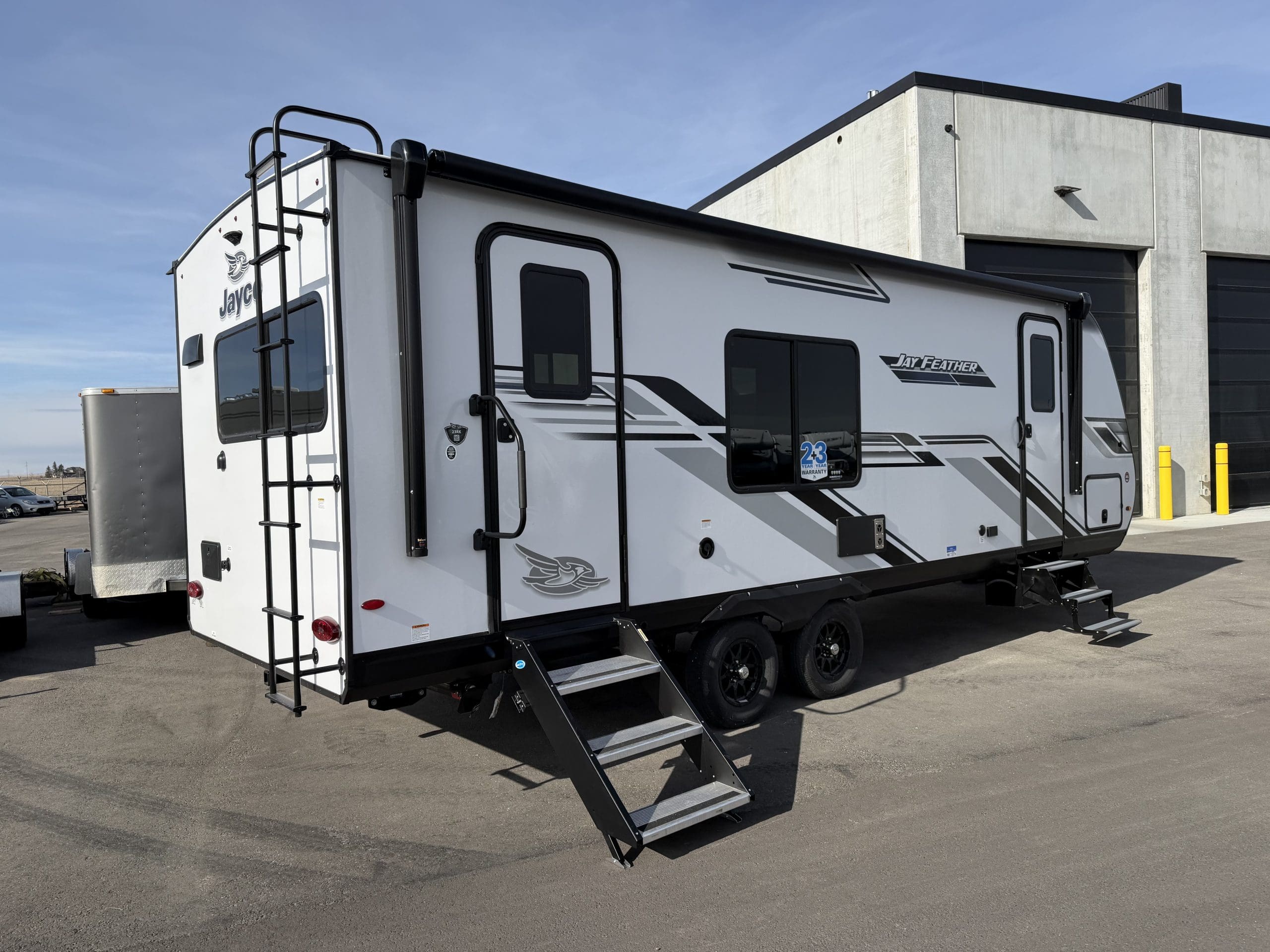 The 2026 Jayco Jay Feather 23RK is a single-slide, rear-kitchen travel trailer. It sleeps 3–4 people, featuring a private front queen bedroom, 6’6″ interior height, 11 cu. ft. 12V fridge, and a large rear kitchen.