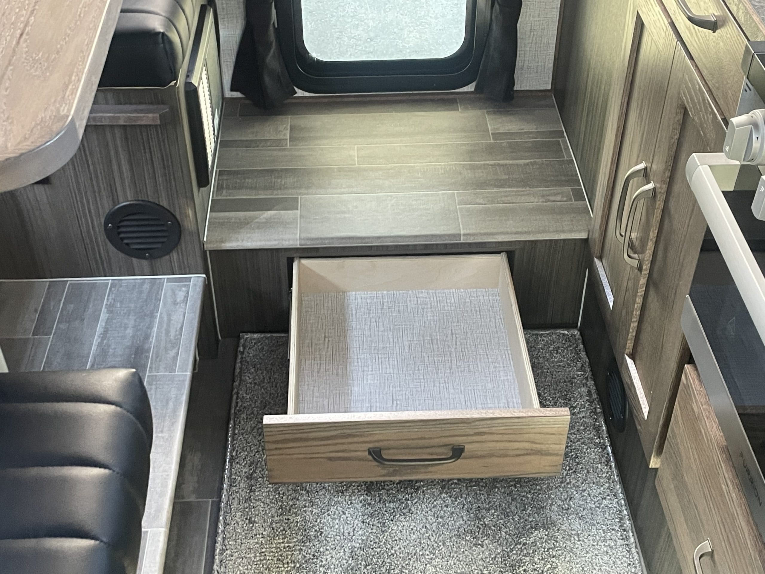The interior of an 10-2 Limited Edition truck camper features a solid Sapele hardwood table, premium leatherette seating, and S4 Deluxe-Dometic windows, plus many other standard and optional features.